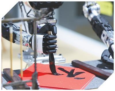 人形机器人在展示写毛笔字。本报记者 张武军摄